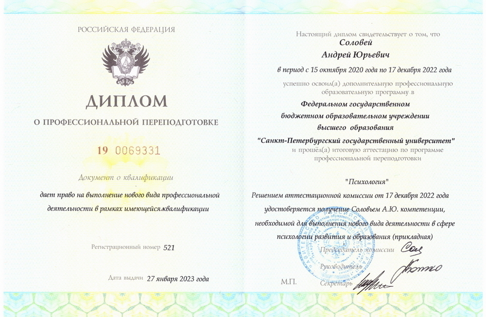 Имею высшее психологическое образование (СПбГУ) и высшее медицинское образование (СПбТИ). Регулярно повышаю уровень профессиональных компетенций.