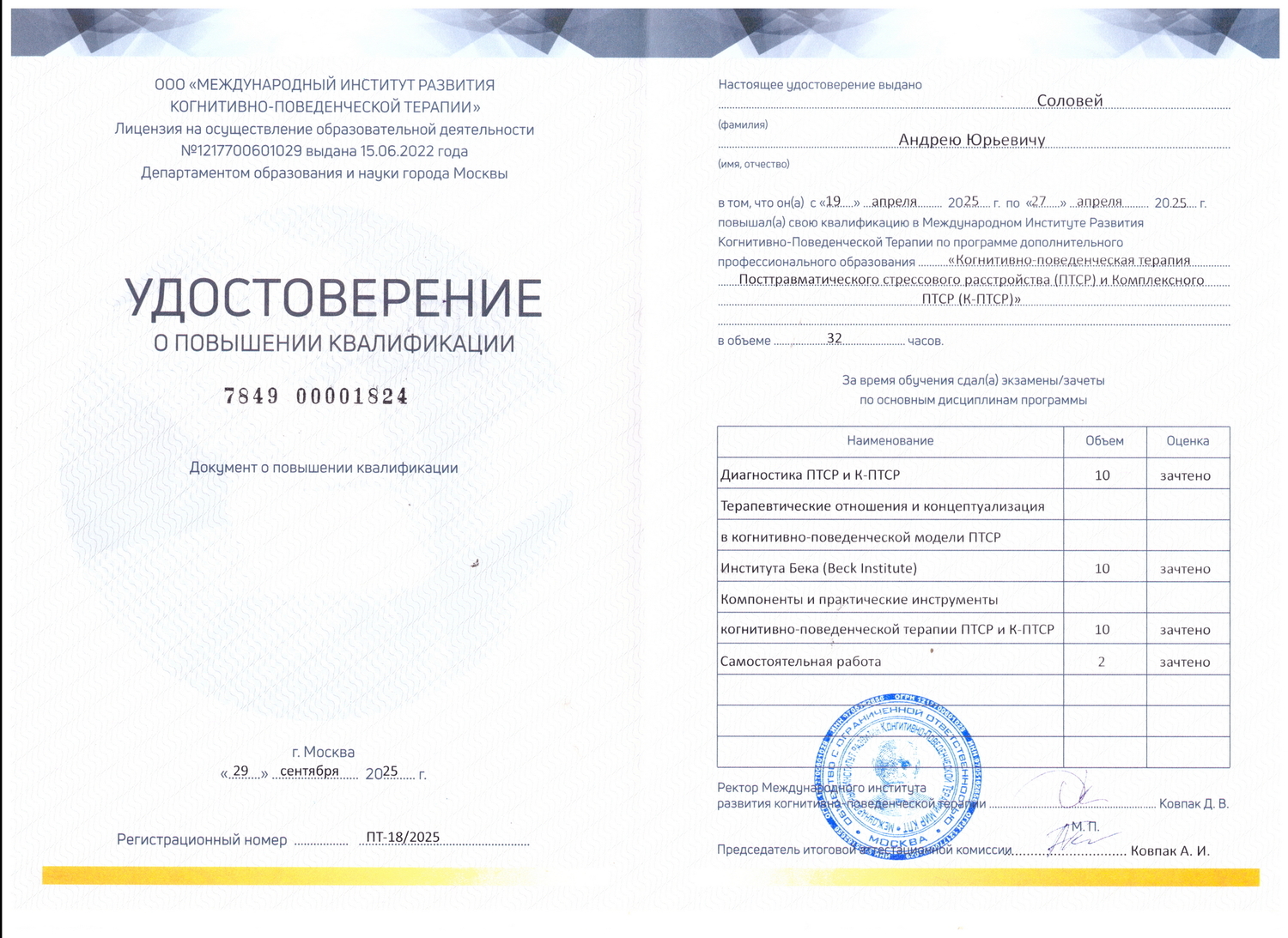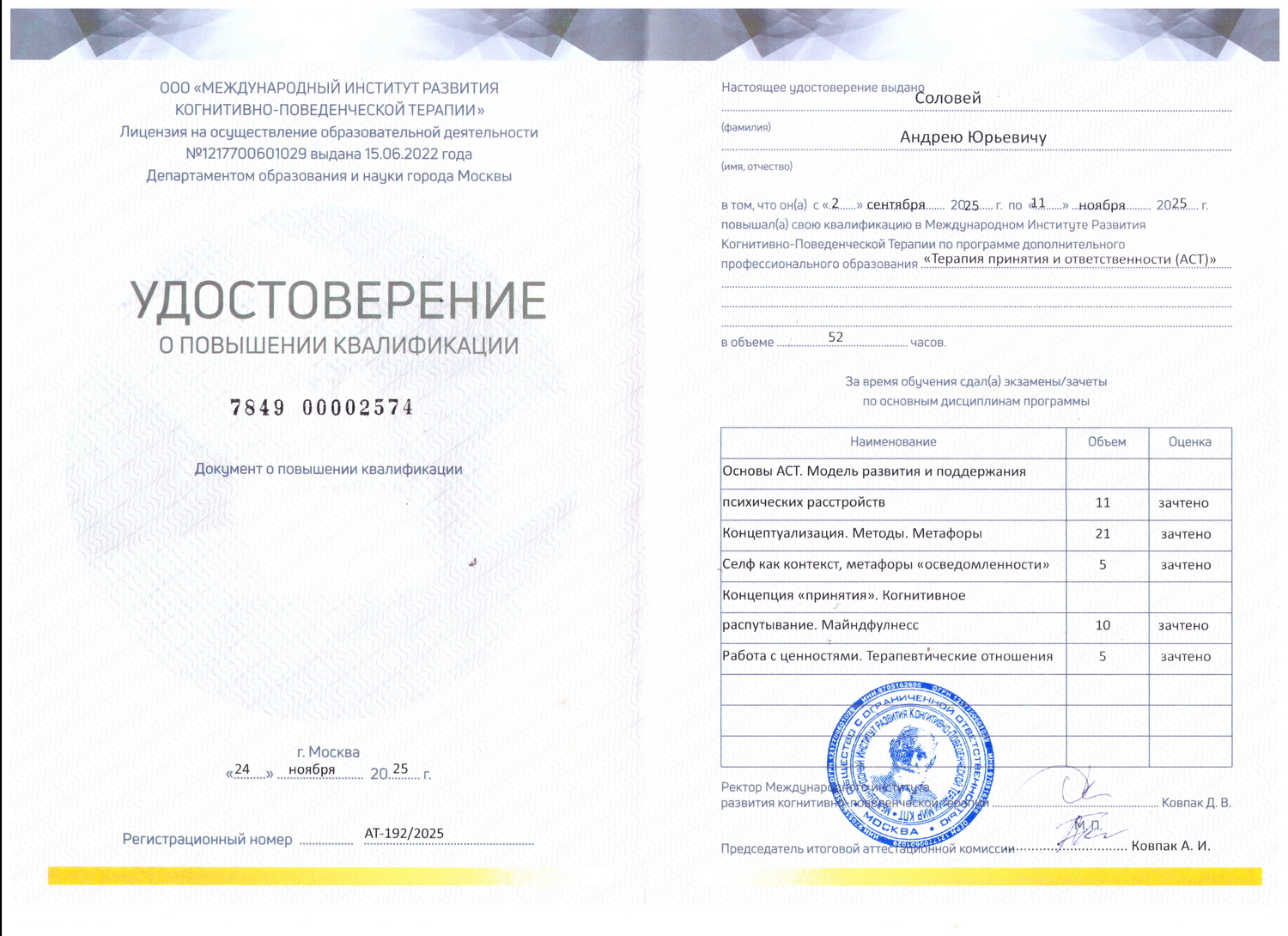 Являюсь действующим членом Ассоциации когнитивно-поведенческой психотерапии.