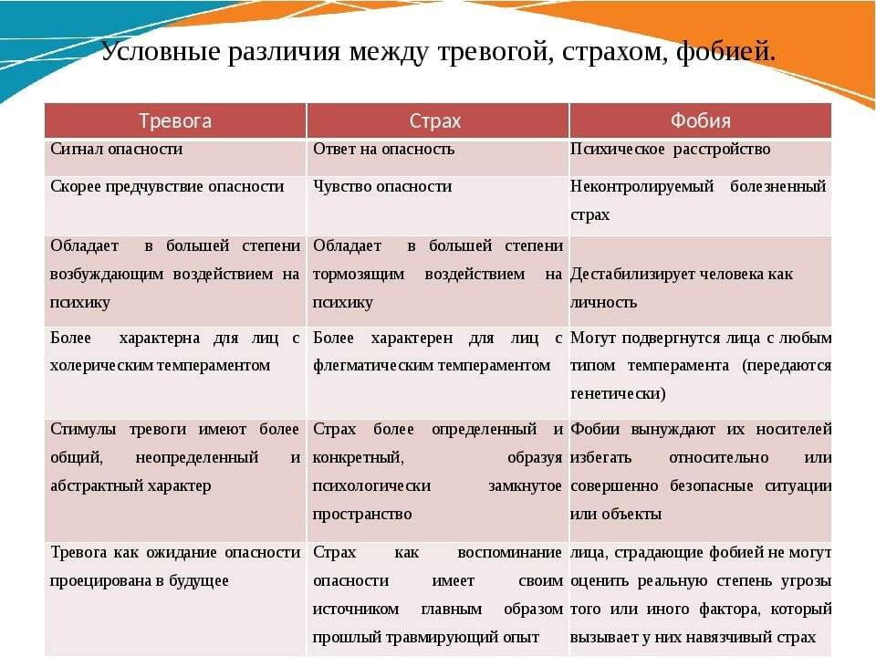 Интересным моментом в понимании тревог, страхов и фобий является их функциональное отличие друг от друга. Так, например, их отличия друг от друга можно увидеть в таблице: