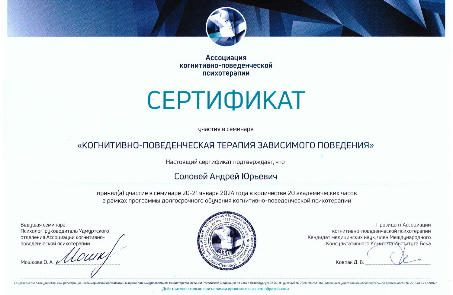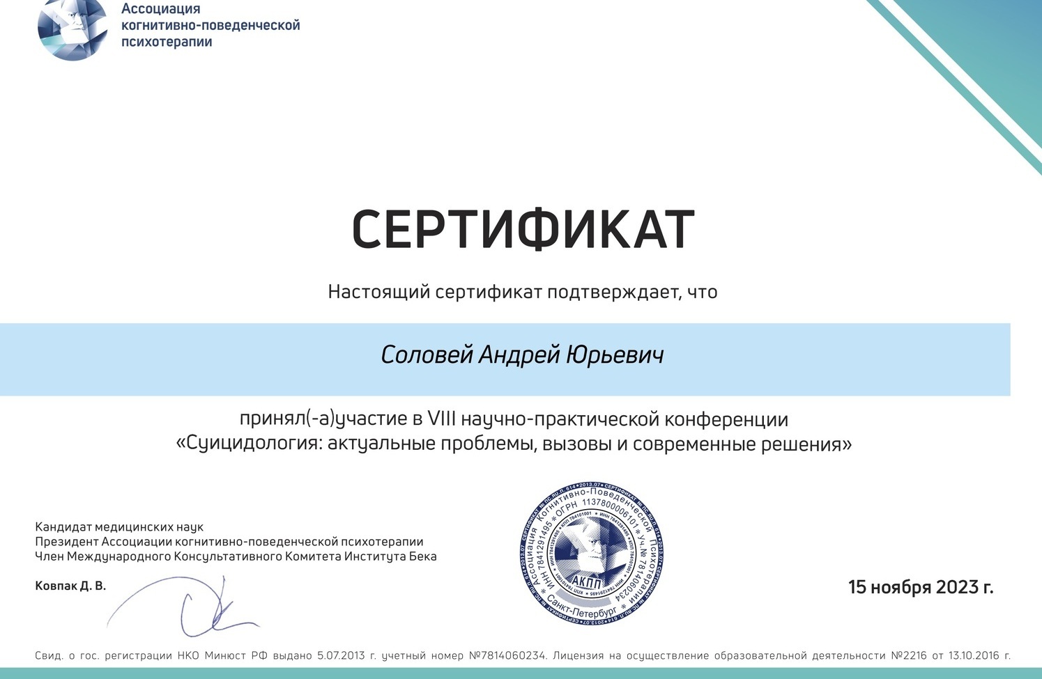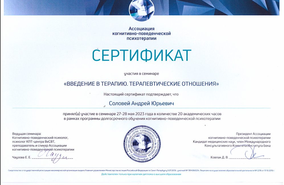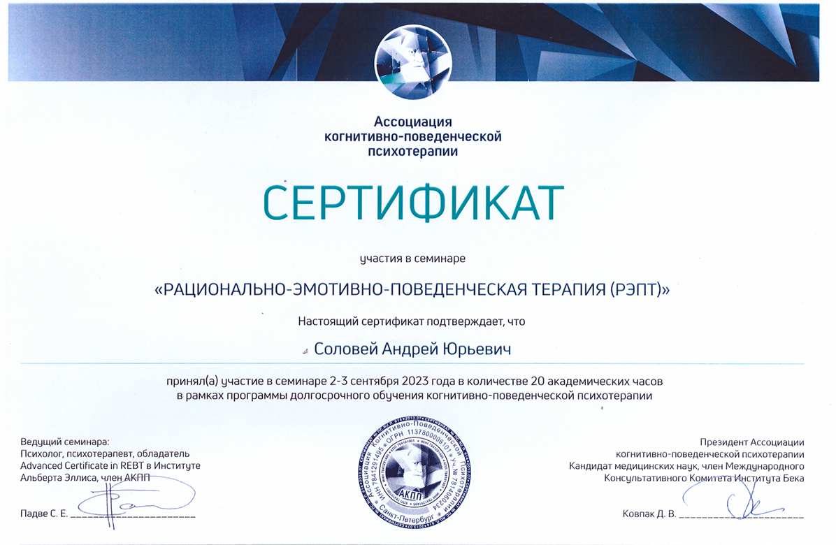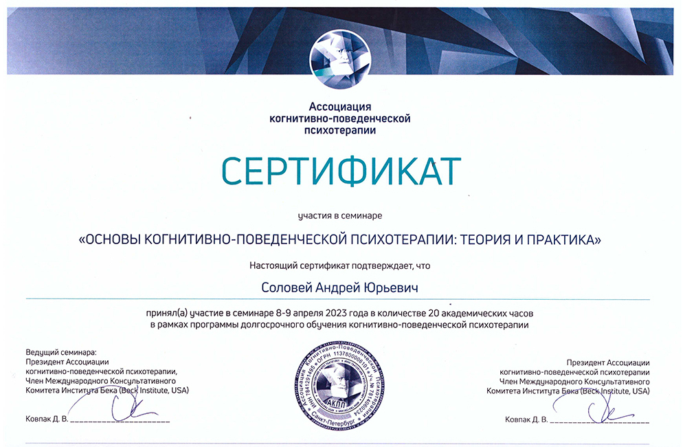 Являюсь действующим членом Ассоциации когнитивно-поведенческой психотерапии.