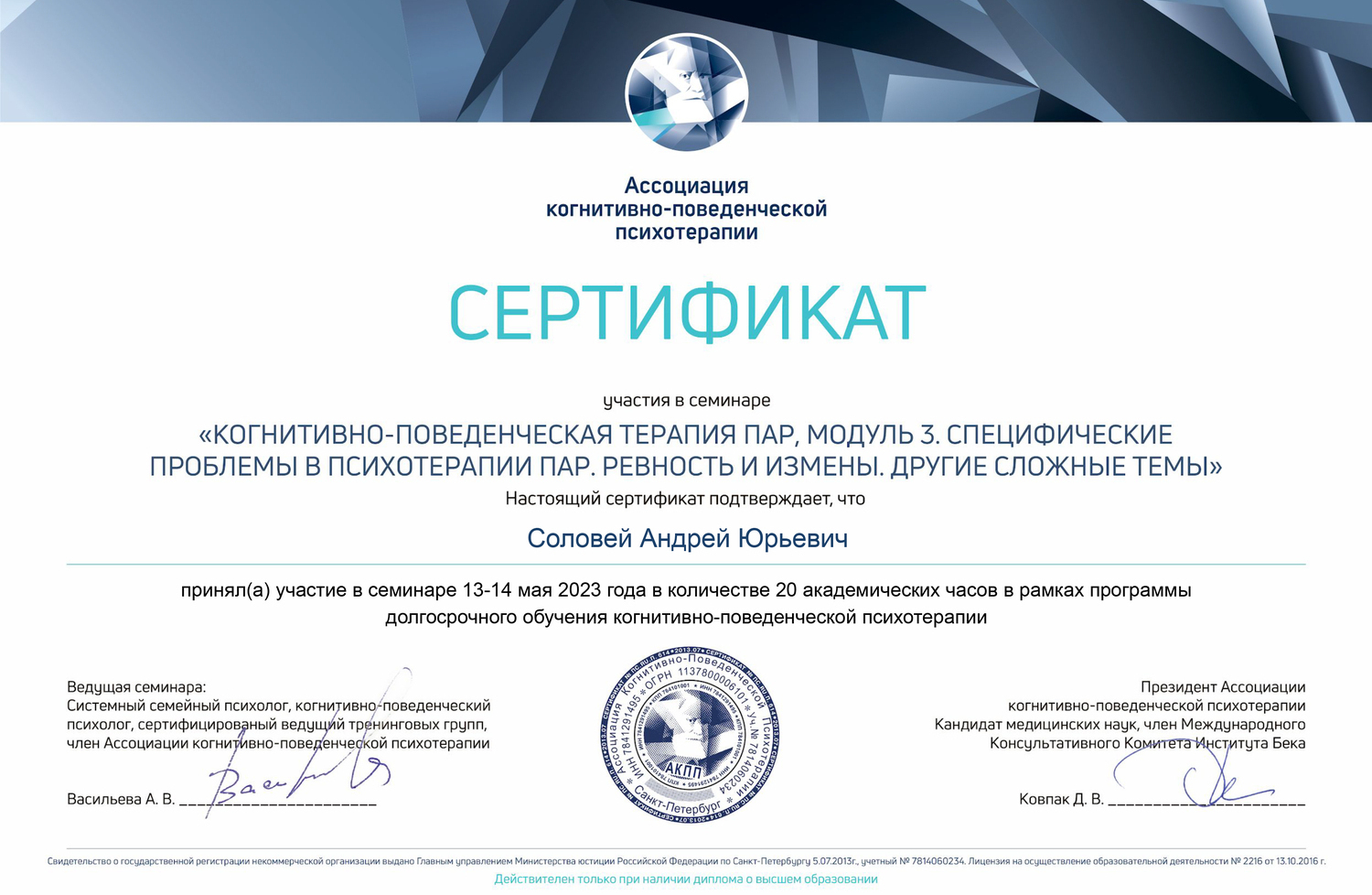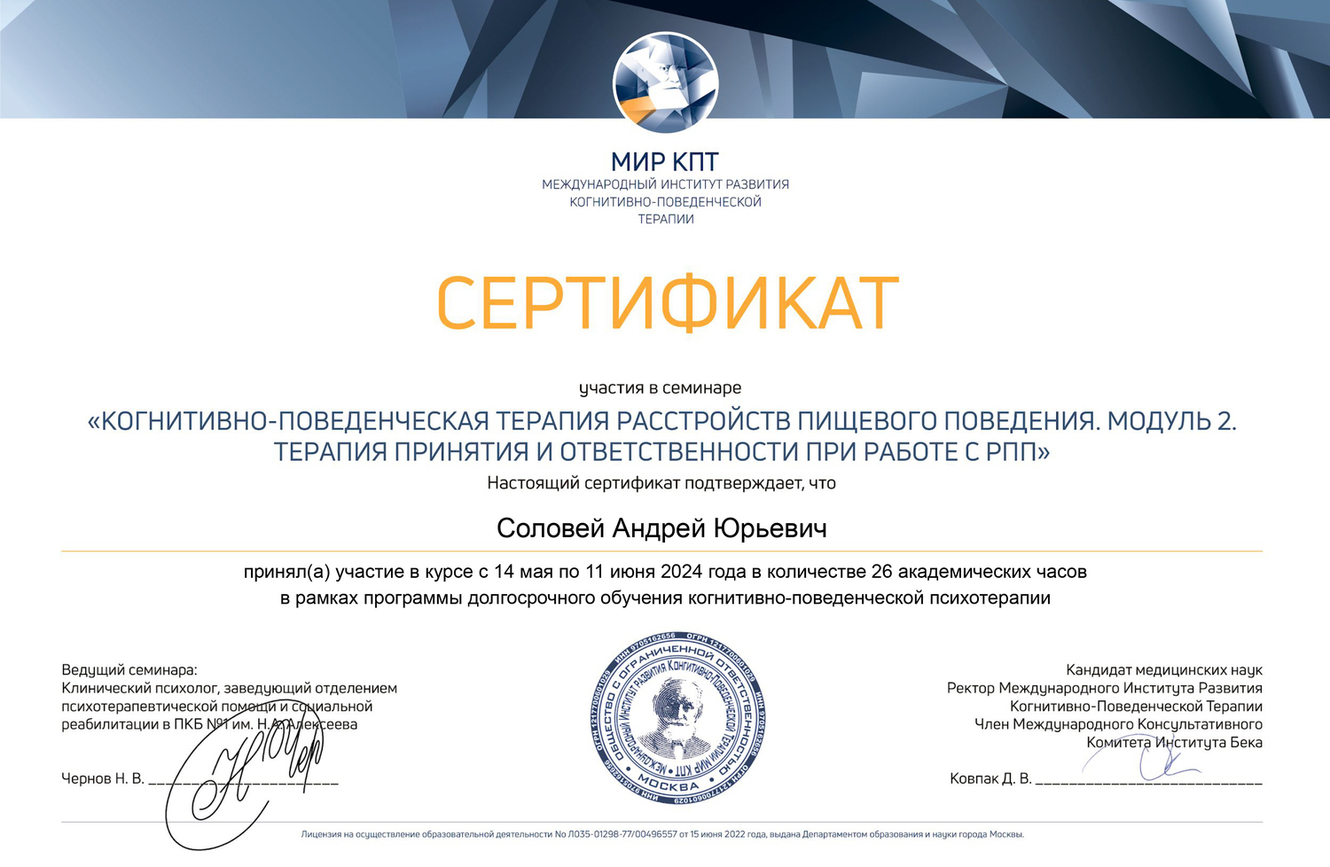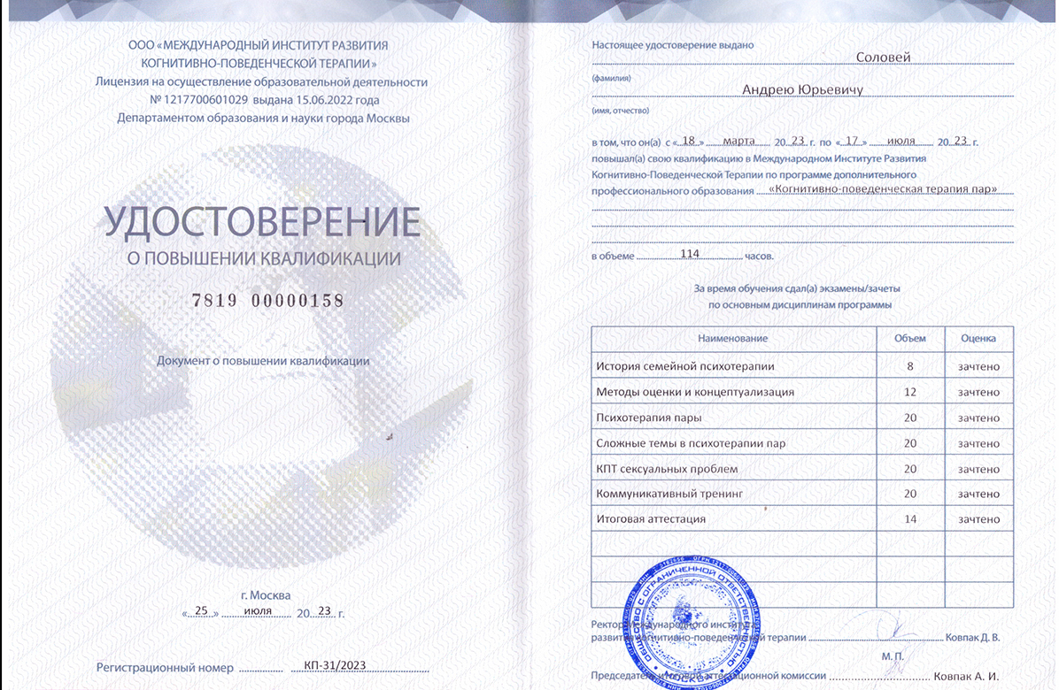 Являюсь действующим членом Ассоциации когнитивно-поведенческой психотерапии.