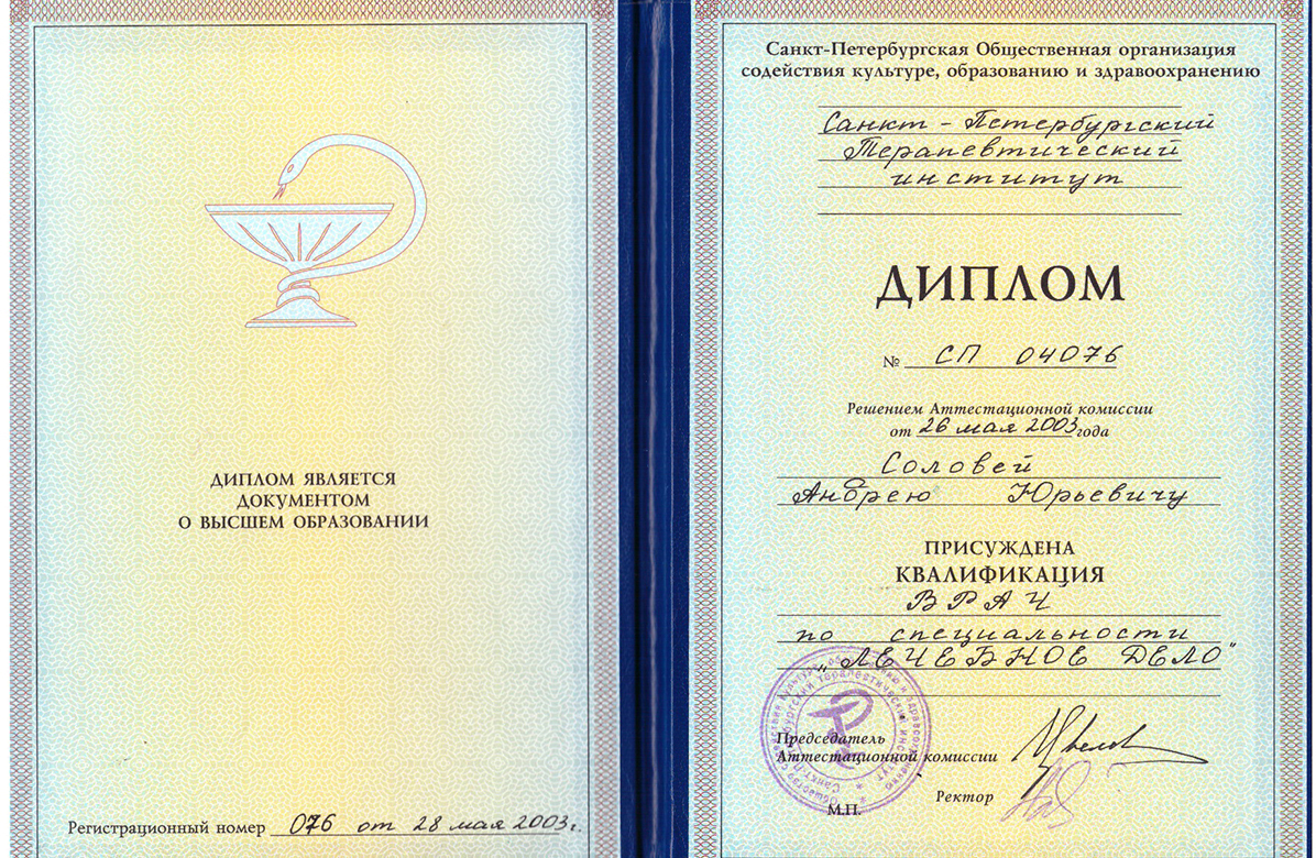 Закончил Санкт-Петербургский Государственный Университет и Санкт-Петербургский Терапевтический Институт.