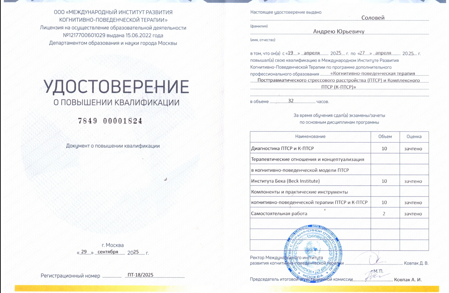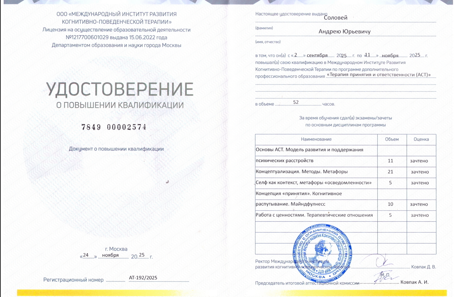 Являюсь действующим членом Ассоциации когнитивно-поведенческой психотерапии.